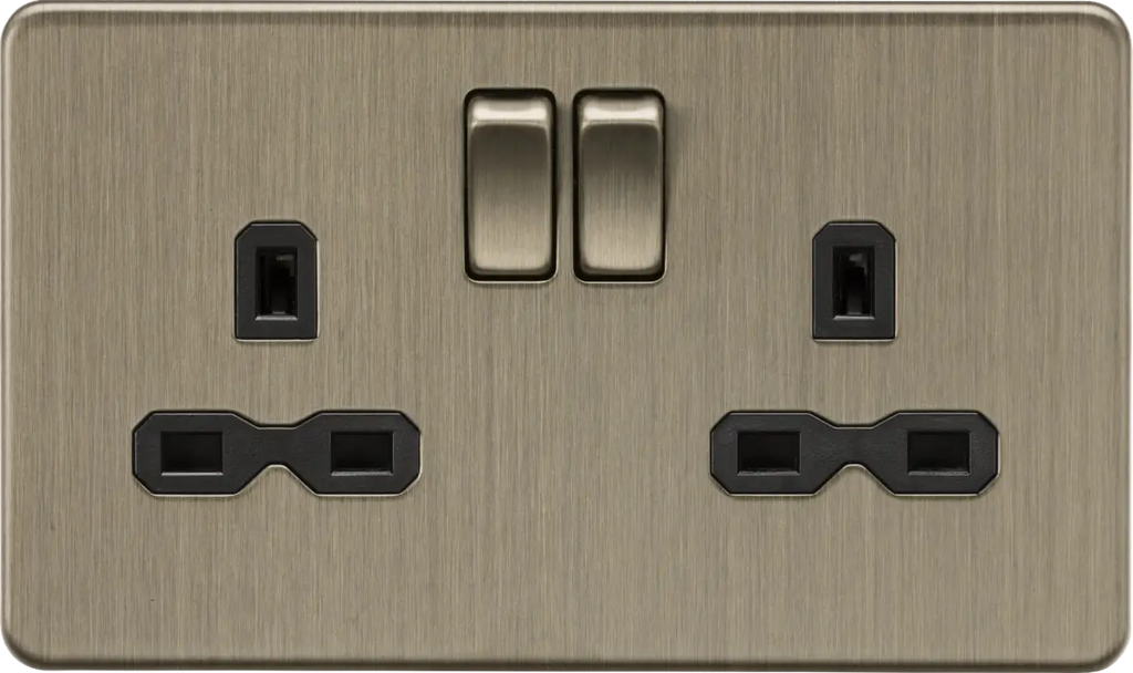 Elevate your interior with this stunning Knightsbridge 13 Amp 2 Gang DP switched socket in antique brass. The screwless low profile metal design with matching metal rockers delivers a flawless, contemporary finish that complements any modern home.